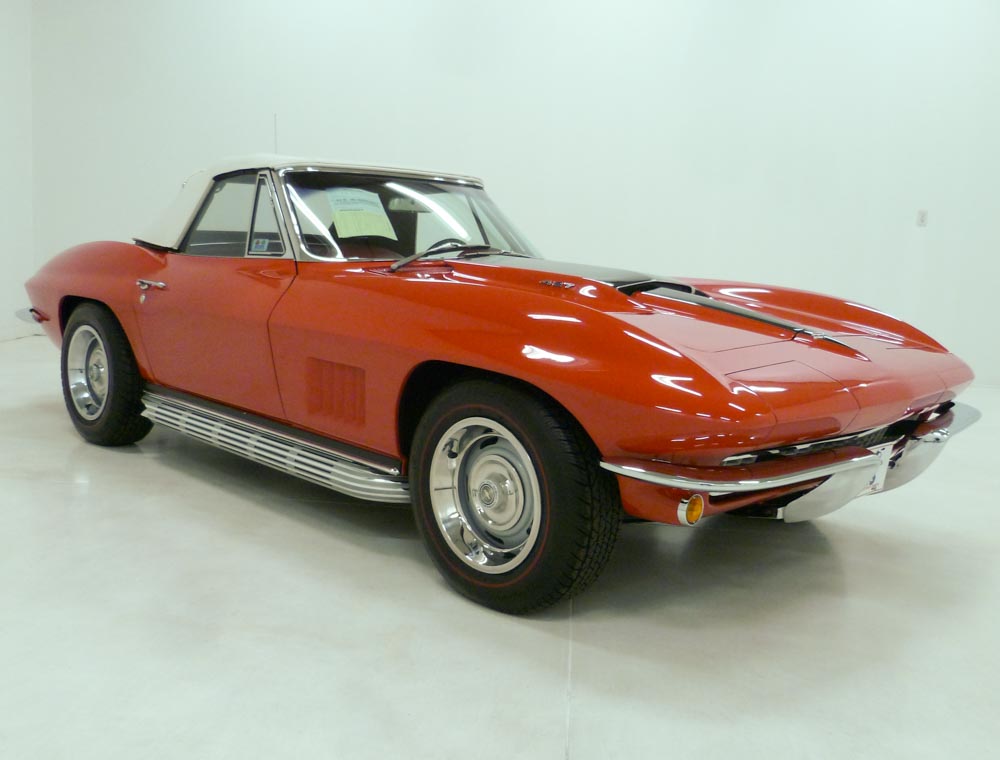 1007U..1967 Corvette Convertible Triple Diamond, 427-435 hp, 4 speed, numbers matching motor, transmission and rear end, also has factory original body/trim tag with a Grenning/CCAS Affirmation. One owner until 2012. Rally Red paint with Black stinger, Black interior and Black soft top. Body-off restored in show condition. These type restorations normally cost between $150,000.00 to $200,000.00. Bloomington Gold certified (2016), NCRS Top Flight award (2016), MCACN Concours Gold and MCACN Triple Diamond award in 2016. The expenses involved in obtaining these awards could surely exceed $20,000.00. Optioned with factory side exhaust (born with), power windows, transistorized ignition, M-21, 4.11 posi, F-41 special heavy duty suspension, SS brakes, AM/FM radio, tri-power, B.O. aluminum wheels and vintage 7.75x15" red stripe tires. Most all factory correct type components including the spare, jack, jack tools, floor mats, seat belts, washer system, tar top battery, shifter, shielding, braided wires, air cleaner, alternator, distributor, hoses, hose clamps, starter, window glass, carbs, radiator, gas door assembly, glove box door, owners manual, sales brochure, and T-3 headlights. Documented with the partial tank sticker, Grenning/CCAS Trim Tag Affirmation, owner history, Bloomington Gold, NCRS, Triple Diamond awards, certificates, judging sheets, NCRS/GM Shipping Data Report and 3-ring binder. Production date of February 21st, 1967 and delivered new by University Chevrolet in Bronx, NY (dealer code 271 in zone 27) per official NCRS/GM Shipping Data Records (SDR). Looks, runs, and drives excellent. CC:1 $225,000.00 SOLD