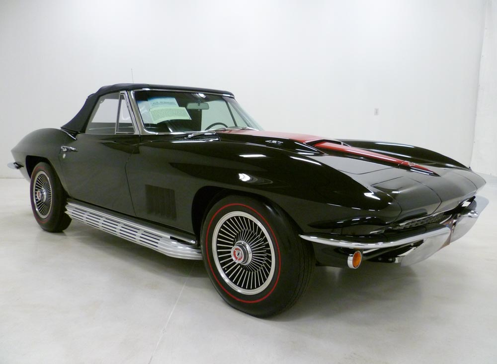 1008W..1967 Corvette Convertible, 427-390 hp, 4 speed, numbers matching original motor, also has factory original body/trim tag. Tuxedo Black paint with Red stinger, Black interior and Black soft top. Comprehensive restoration that appears body-off in show condition for Bloomington Gold and NCRS type judging. Optioned with factory side exhaust, leather, M-21, posi, SS brakes, AM/FM radio, B.O. aluminum wheels and vintage Firestone 7.75x15" red stripe tires. Most all factory correct type components including the spare, jack handle, clear floor mats, shocks, seat belts, washer system, tar top battery, shifter, shielding, braided wires, air cleaner, alternator, #3811 carb, hoses, hose clamps, radiator, gas door assembly, Bowtie mirror, glove box door, owners manual and sales brochure. Documented with owner history, two show boards and the NCRS Shipping Data Report with production date of September 6th, 1966 and delivered new by Van Chevrolet in Shawnee Mission, KS (dealer code 885 in zone 5) per the official NCRS/GM Shipping Data Records (SDR). The engine Stamp Grenning/CCAS Affirmation is pending. This recently restored Corvette has yet to be shown, creating an exciting opportunity for the next owner to exhibit the car and compete for trophies, awards, and recognition! Looks, runs, and drives excellent. CC+2 $149,000.00